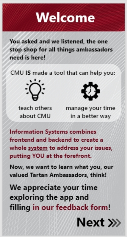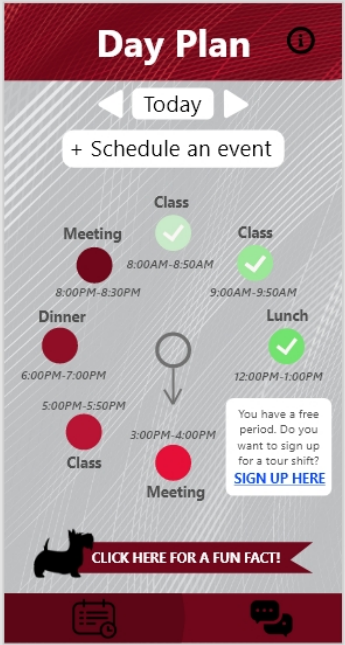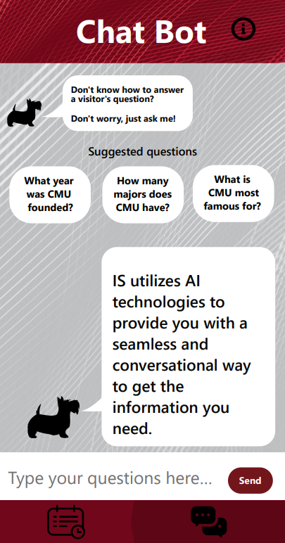 Understanding the concern of CMU student tour guides with balancing schoolwork and their job, we applied the principles of IS, such as database management and systems thinking, to create a mobile application that can help them keep track of their schedule. Additionally, we utilized the IS principle of applying current technologies to address user needs by incorporating an AI chatbot that answers any questions that they get on tour that they are not confident about how to answer to help them achieve their goal of helping others learn more about CMU. On top of all this, we added a page where users can give feedback. Information Systems is all about collecting, creating, and distributing useful data, so we will use their feedback to make the best version of the app possible. These three components make IS relevant to the tour guides because they demonstrate to them how the knowledge and skills IS majors acquire in their studies can help address real-world problems that they have. Users will be made aware that it is IS that brought to them this relevant product from the interactive elements strategically placed throughout the app revealing how different areas of IS played a part in the creation of each feature and the app as a whole.